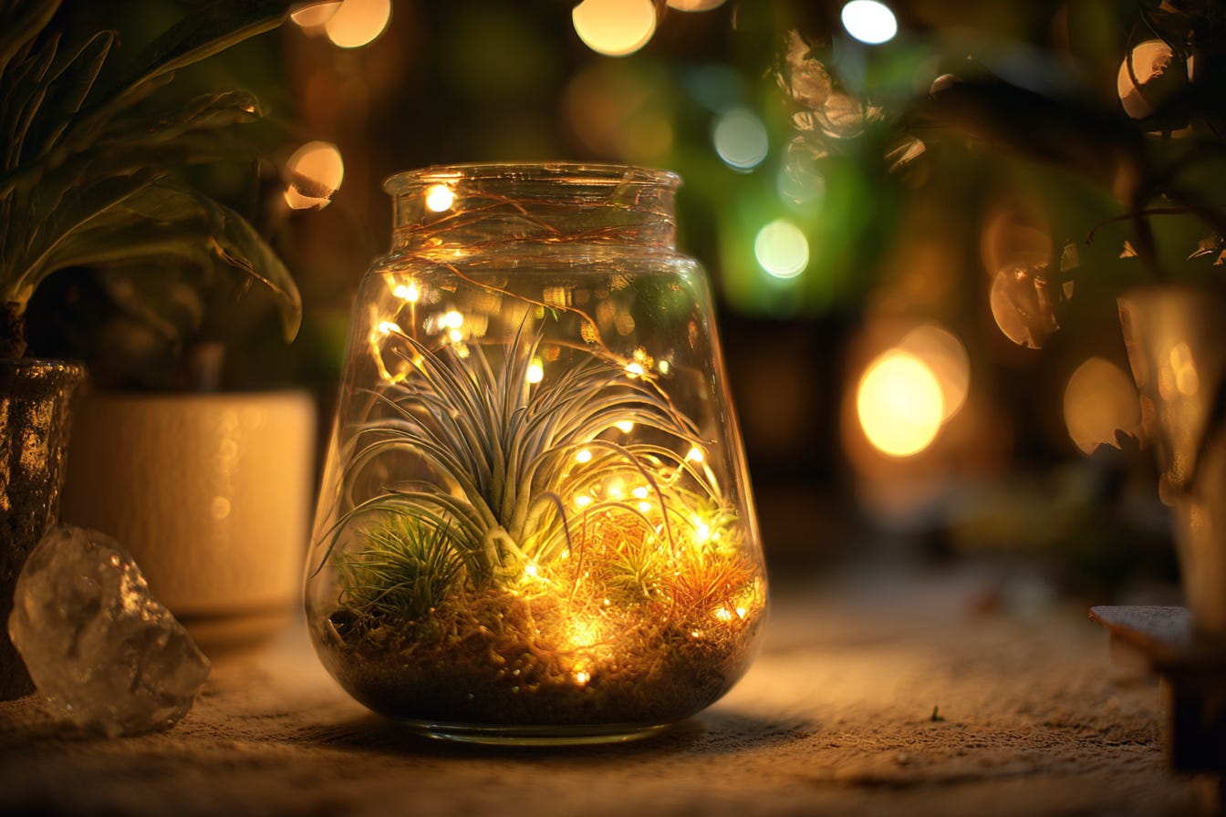 Grab a small glass planter, an air plant, some pebbles or moss if youâd like, and a tiny strand of LED fairy lights. Layer the lights inside the planter with the pebbles or moss, then nestle the air plant on top so it sits like a little forest spirit in its glowing cave.
